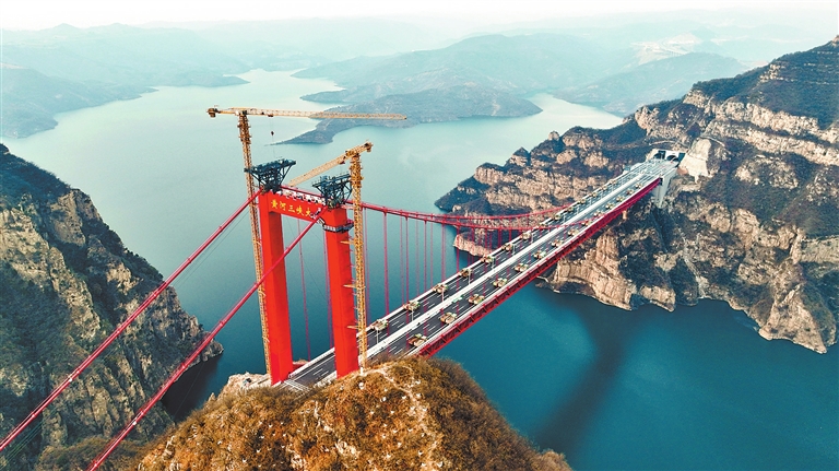 12月5日,济源与洛阳新安县交界处的黄河段上,世界首座独塔地锚式回转缆悬索桥——济新高速黄河三峡大桥荷载试验圆满完成,标志着大桥主体具备正式通车条件。王铮 雷克林 摄